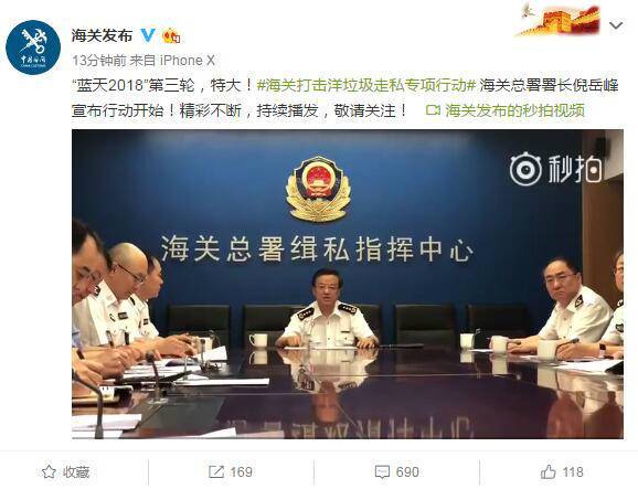 据微博@海关发布 消息,海关总署署长倪岳峰宣布“蓝天2018”第三轮,特大海关打击洋垃圾走私专项行动开始!