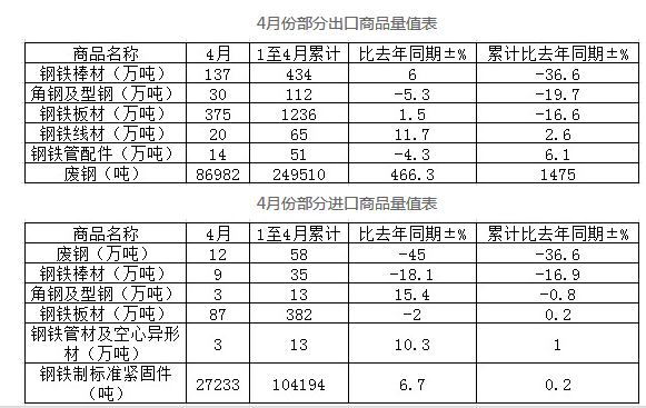 4月份,我国出口钢铁棒材137万吨,同比增长6%;1-4月累计出口434万吨,同比下降36.6%。