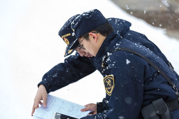 图为:南京海关关员冒雪实施查验 杨阳/摄