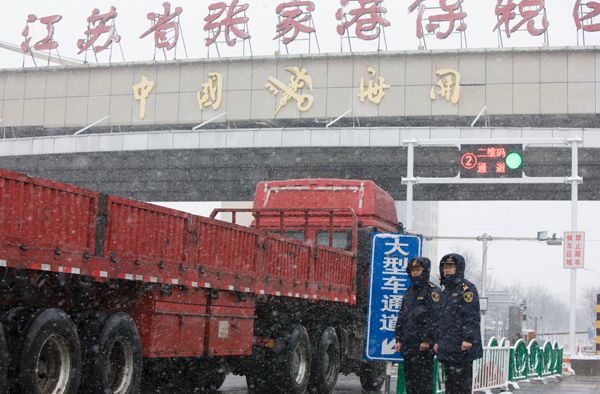 图为:南京海关隶属张家港保税港区海关关员冒雪保障监管场所道路通畅 施东海/摄