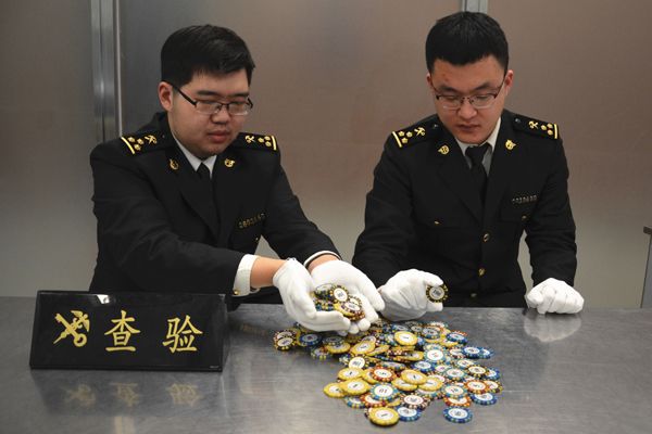 图为:海关关员对赌博筹码进行查验 张艺子/摄