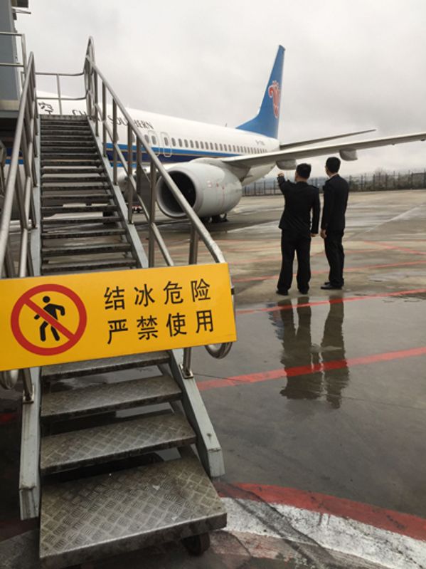 图为:贵阳海关旅检关员在凝冻环境下监管进出境航班 陆燮/摄