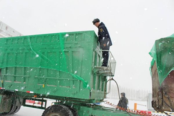 2月26日,呼和浩特海关辖区部分口岸出现气温骤降及大雪天气。现场关员克服恶劣天气影响,及时安排人员引导、维护车辆出入境秩序,确保运输工具安全、快速通关。同时,对进出境运输工具加强随机及重点检查。(付旭东/文)