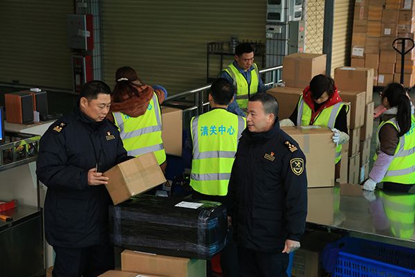 图为:广州海关辖下韶关海关关员在跨境电商通关现场巡查 王震/摄