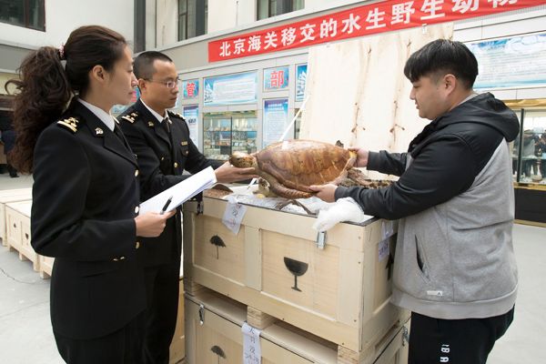 3月21日,在延庆,北京市农业局水生野生动植物救护中心,北京海关正式向北京市农业局移交大凤螺、砗磲和玳瑁、鳄鱼等470件濒危野生水生动植物制品。