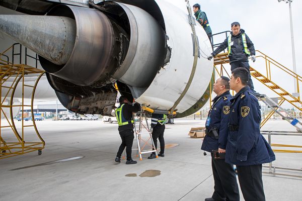 图为:南京海关所属金陵海关关员在停机坪对飞机维修进行监管 钱佳/摄