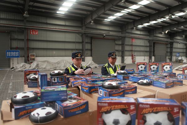 图为:宁波海关关员正在查看侵犯“RUSSIA 2018”商标权电动足球 张佐/摄