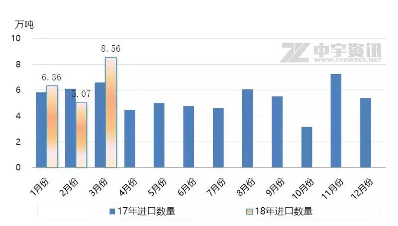 一季度海关数据显示,二乙二醇进口量整体呈增长态势,根据海关统计数据显示:2018年3月进口二甘醇8.56万吨,进口均价846.35美元/吨。进口量较上月增加3.49万或或是68.89%,创下历史新高,2017年的全年进口量在64.63万吨,月均在5.39万吨,由此来看,3月份的进口量是2017年月均进口量的1.59倍,过多的进口货源是国内二乙二醇市场的重要利空因素。