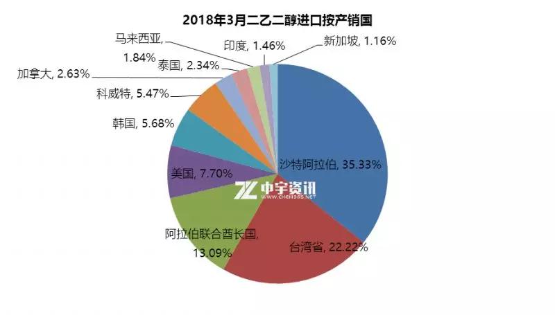 从3月二乙二醇进口按产销国统计,中东的沙特,台湾、阿拉伯联合尊长国是我国二乙二醇进口的前三位地区,分别占比在35.33%、22.22%及13.09%,合计70.64%,中东地区依旧是我国最主要的进口区域。另外韩国、科威特占比在5.5-5.7%。