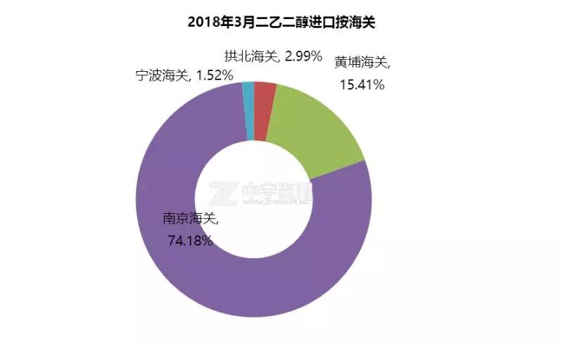 数据统计显示,今年3月二乙二醇进口海关前三分别是南京、黄埔、宁波海关,占比分别在74.18%、16%、2%。南京、黄埔海关进口量增加,宁波海关降低明显,较上月降低近5%。
