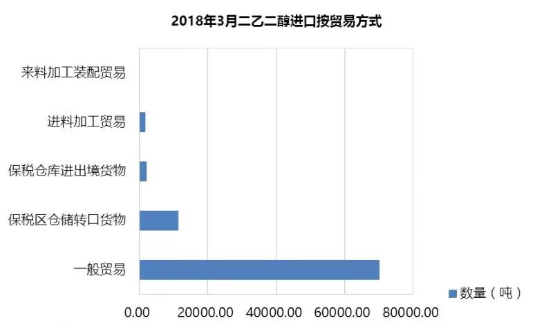3月二乙二醇进口量中以一般贸易为主要的进口贸易方式,占比达81.97%,较上月环比增加7.52%,保税区仓储转口货物占比13.36%,保税仓库进出境货物占比2.45%。