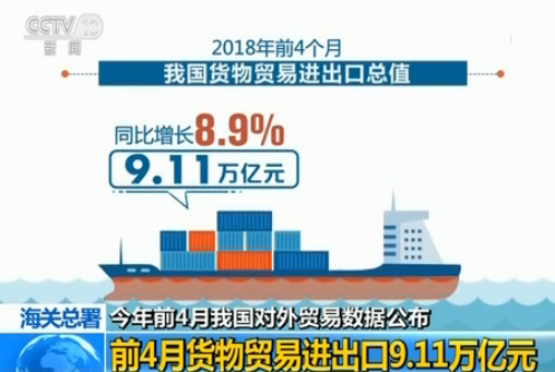 海关总署今天(5月8日)公布:今年前4个月,我国货物贸易进出口9.11万亿元人民币,同比增长8.9%。对外贸易继续保持稳中向好势头。