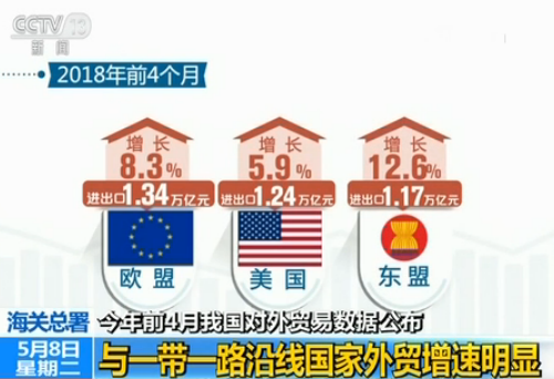 海关统计显示:今年前4个月,欧盟、美国和东盟仍为我国前三大贸易伙伴。其中,与欧盟进出口1.34万亿元,增长8.3%;与美国进出口1.24万亿元,增长5.9%;与东盟进出口1.17万亿元,增长12.6%。